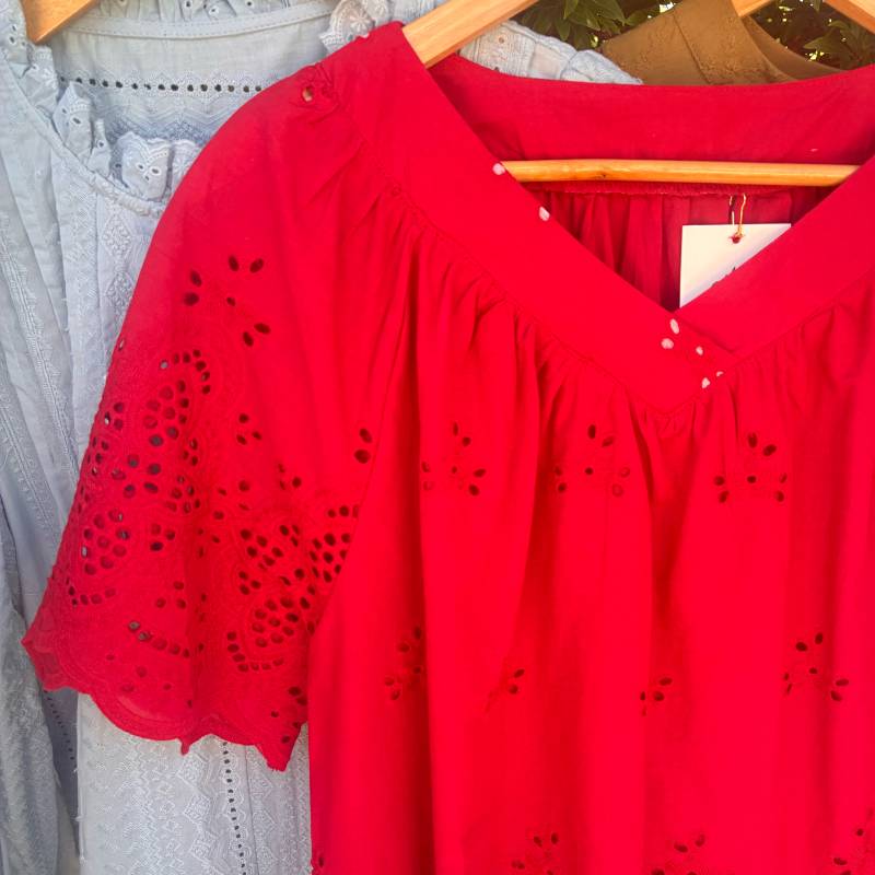 Blusa de algodón con detalle en broderie. Cuello en V que estiliza, además cuenta con un forro en el mismo algodón en su parte delantera y tiene manga corta con terminación en broderie.