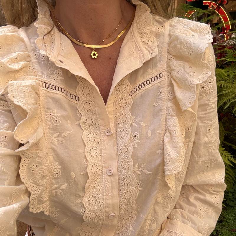 Blusa blanca de algodón, manga larga, cuello camisero, broderie de algodón en cuello y puño más incrustaciones en la parte delantera.