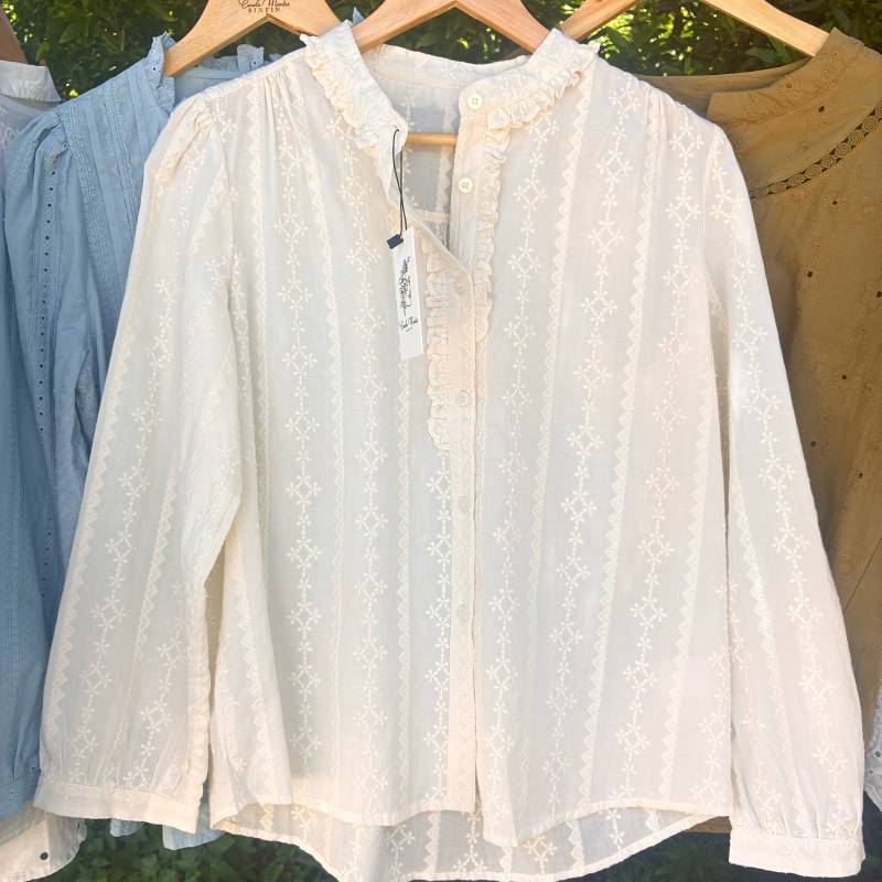 Blusa manga larga, algodón. Cuello abierto, coqueto. En tonos rojos y beige. Entallada. La cinta se puede poner y sacar en la parte delantera.