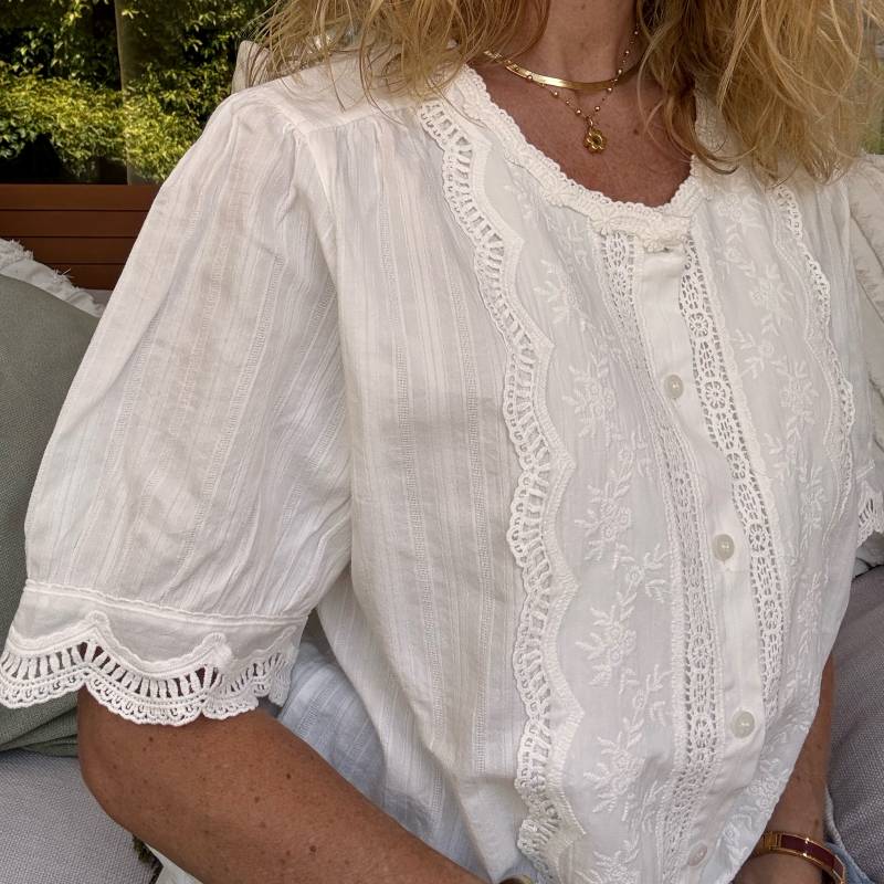 Blusa de algodón, manga corta, detalles en broderie. Cuello redondo. Abotonada adelante.