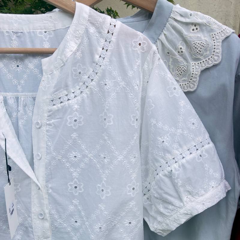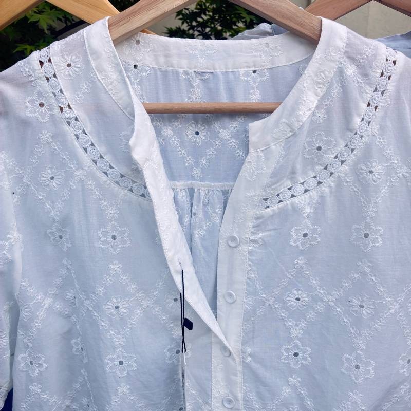 Blusa de algodón bordado, manga 3/4, cuello redondo, abotonada adelante hasta la mitad. Botones forrados.