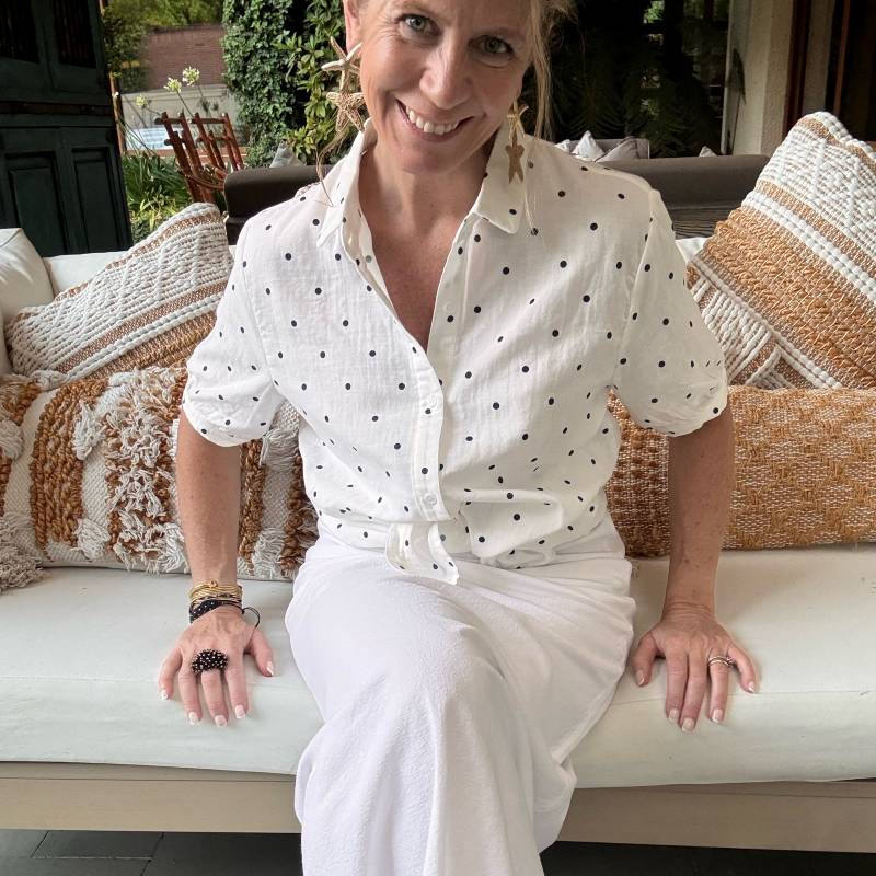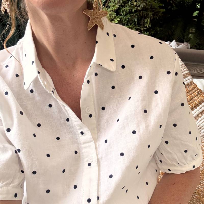 Blusa de algodón, manga corta. En color blanco con lunares en azul marino.