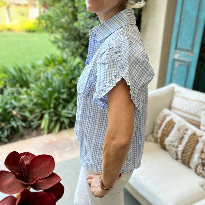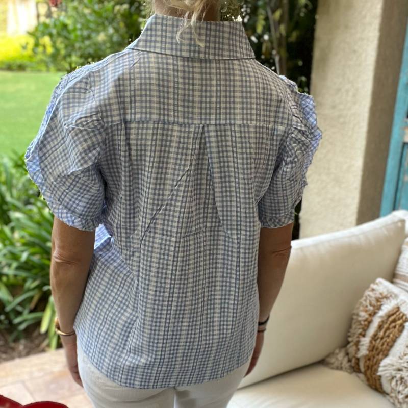 Blusa manga corta, cuadrillé celeste.