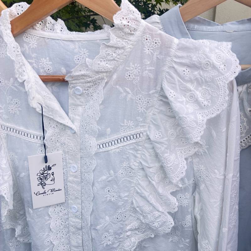Blusa de algodón, manga larga, muchos detalles incomparables. Vuelos en cuello, bajada frontal.