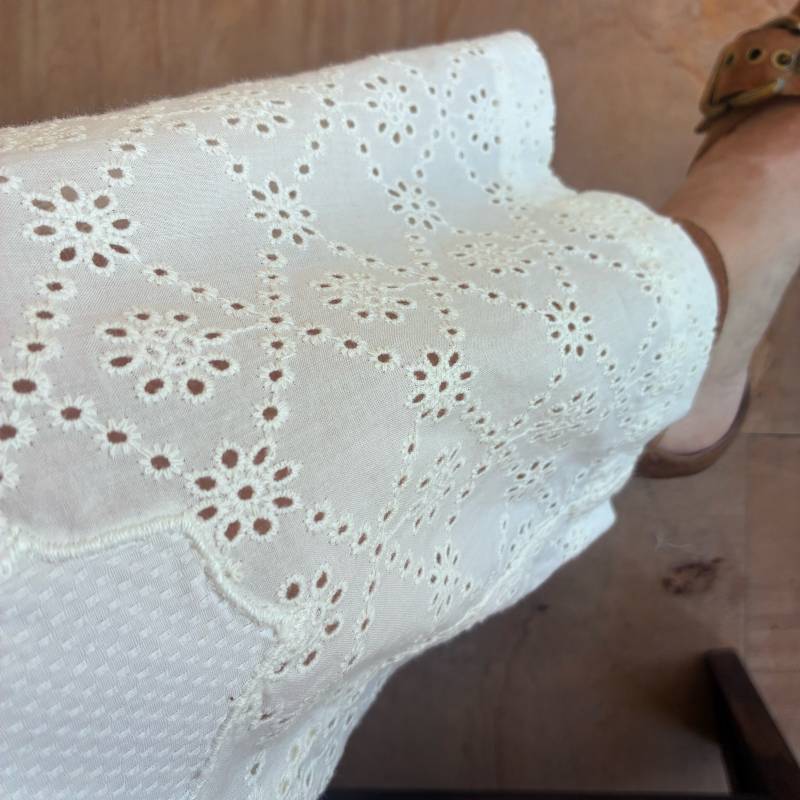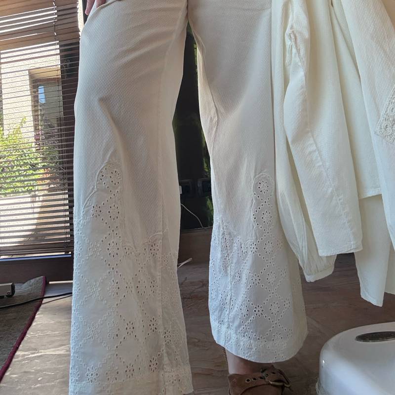 Pantalón blanco con detalles en broderie. Bolsillos. Cintura semi elasticada (adelante botón y cierre, atrás elástico)