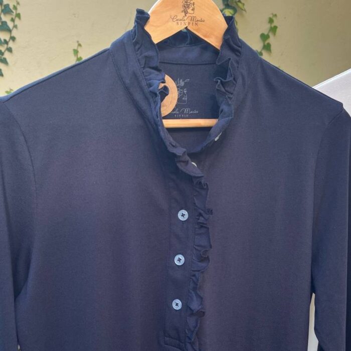 Polera de algodón pima peruano (piqué) de calidad superior. Manga larga. Cuello mao y abotonada adelante hasta la mitad. Detalles de vuelos en todo el cuello y orilla de botones.
