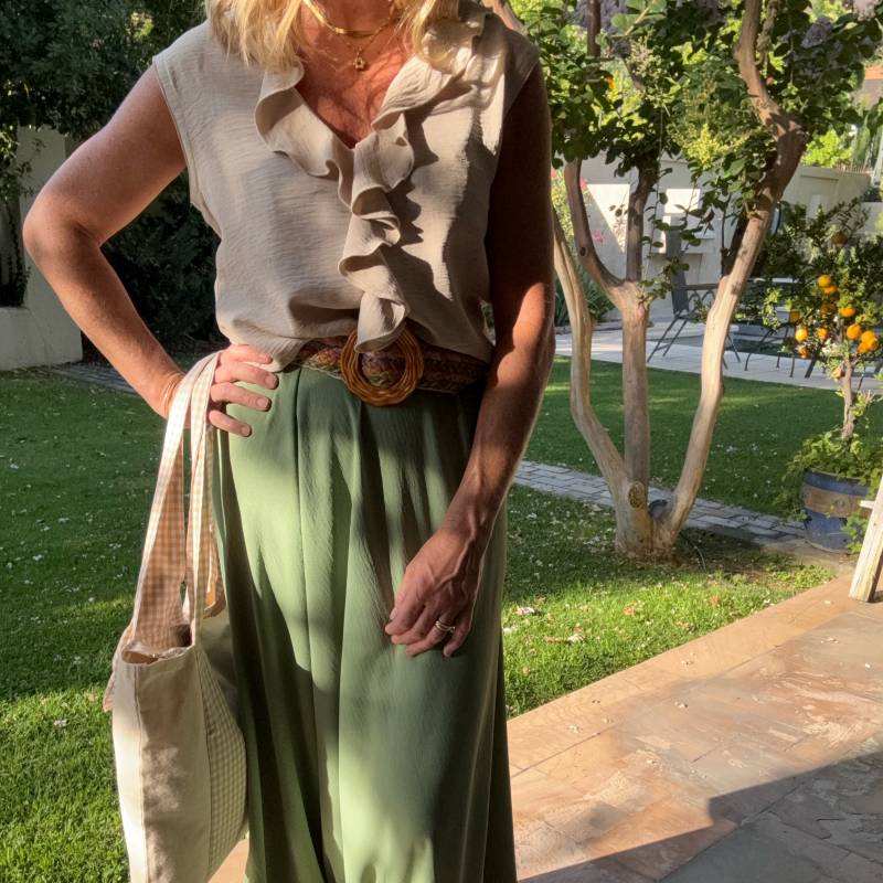 Pollera larga, cintura elasticada no recogida. Tiene un movimiento y caída precioso