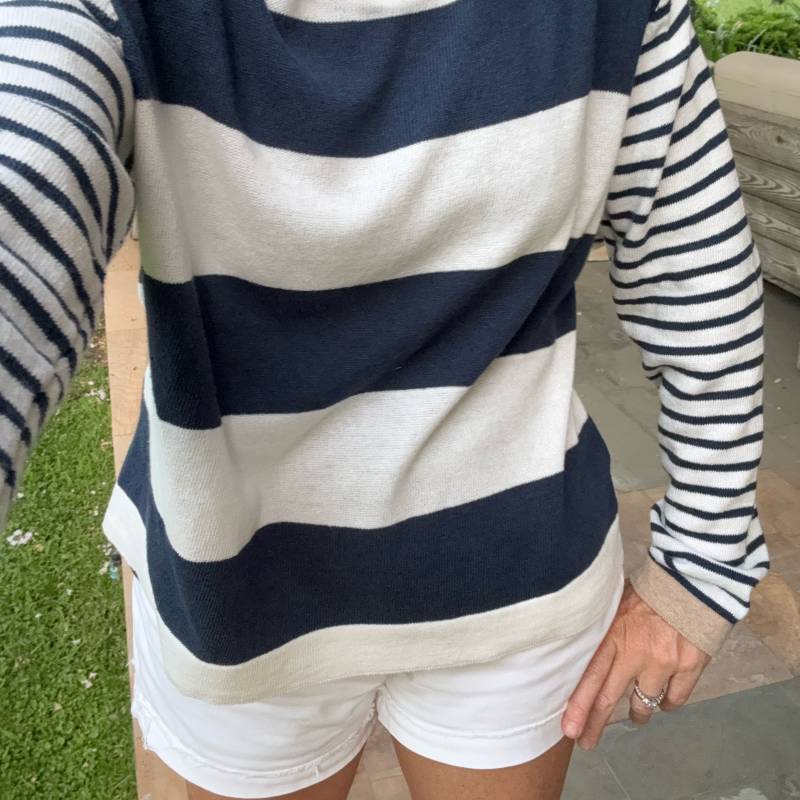 Sweater de hilo para las tardes frescas de verano. Colores de verano en líneas que juegan en su diseño.