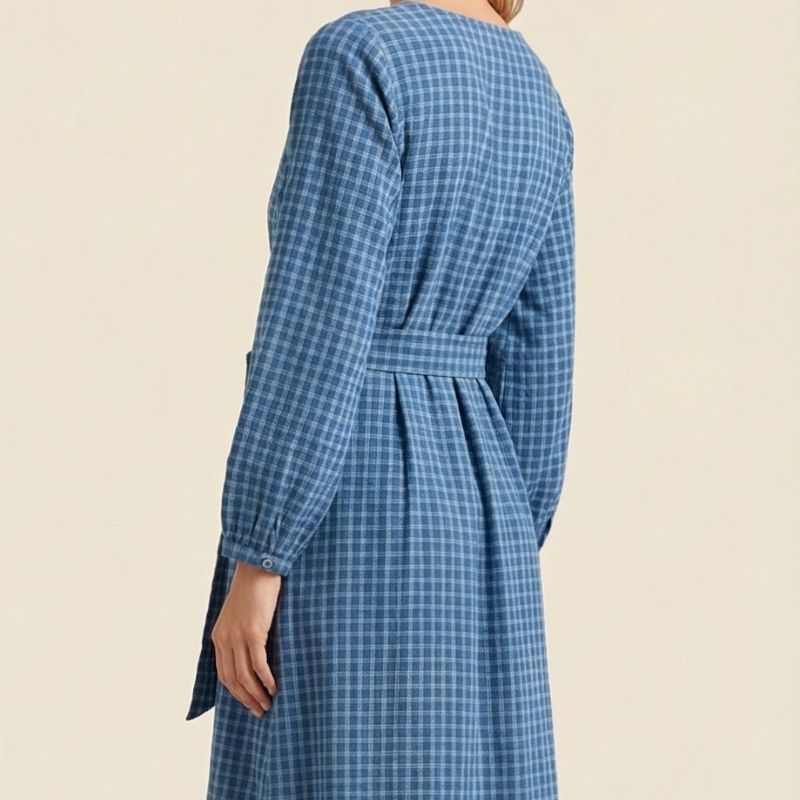 Vestido de algodón de manga larga con delicado diseño en cuadros y bordados florales que aportan un toque femenino y artesanal. Su silueta cómoda con cinturón ajustable realza la figura, mientras que los detalles bordados en el pecho y el ruedo crean una prenda romántica y elegante, perfecta para usar durante todo el día.