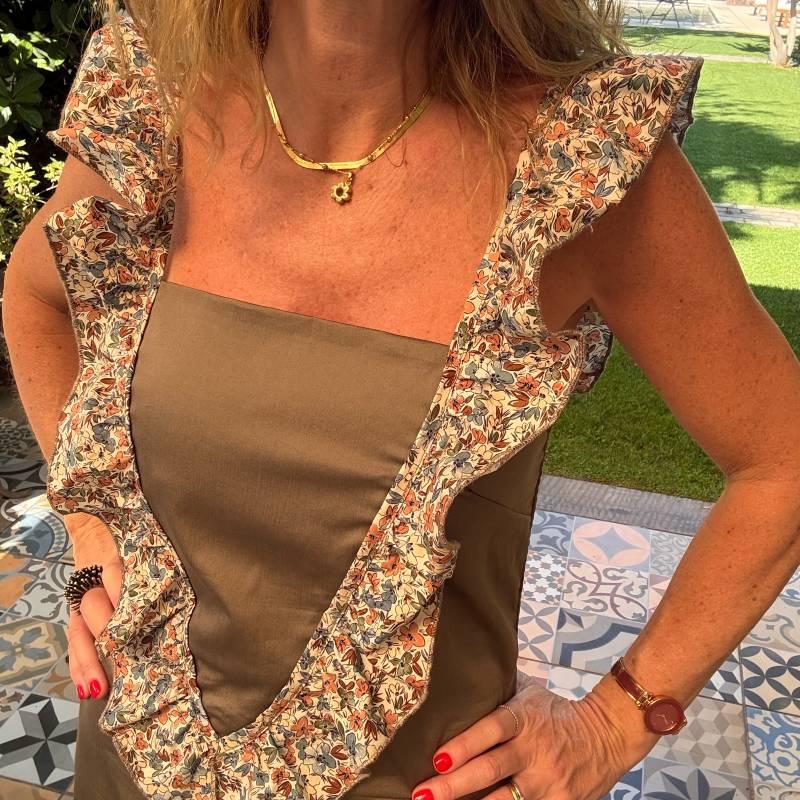 Vestido largo de algodón pima plano, elasticado en la espalda, escote cuadrado. Diseño en V por adelante, y un ruedo ancho el final de la pollera.