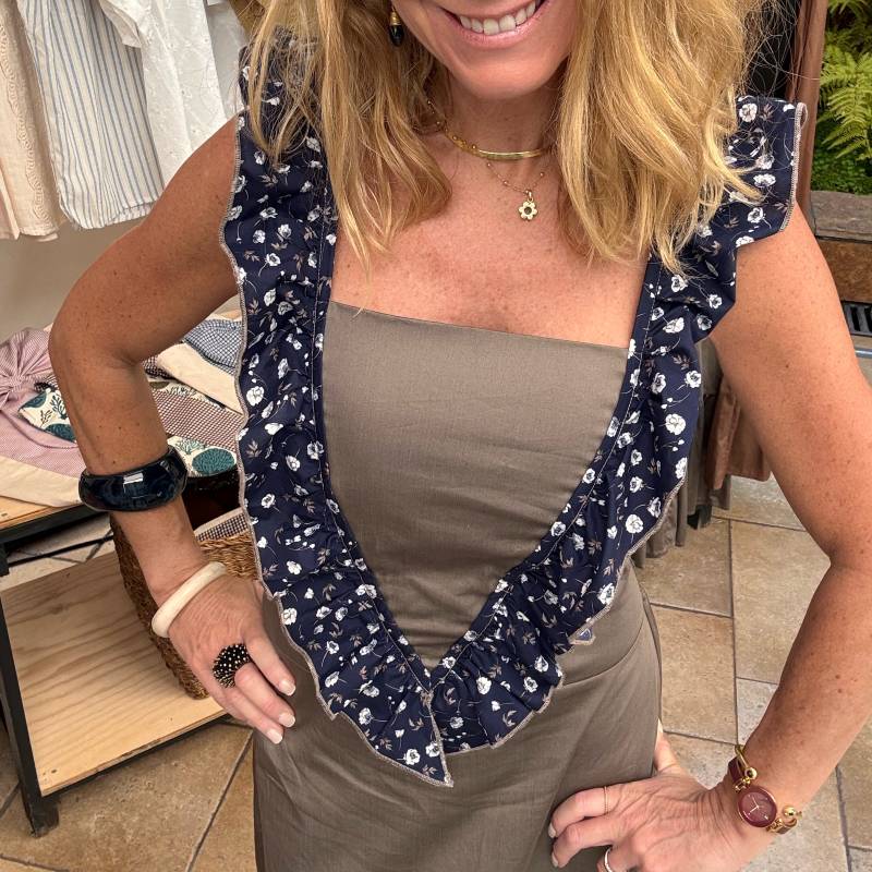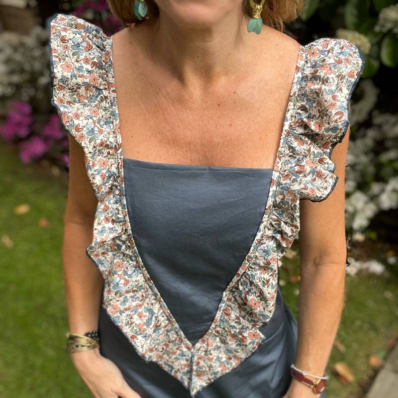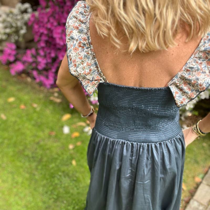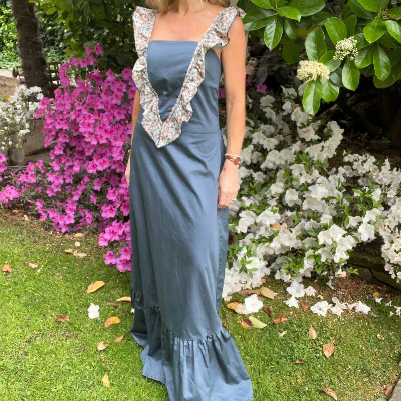 Vestido largo de algodón pima plano, elasticado en la espalda, escote cuadrado. Diseño en V por adelante, y un ruedo ancho el final de la pollera.