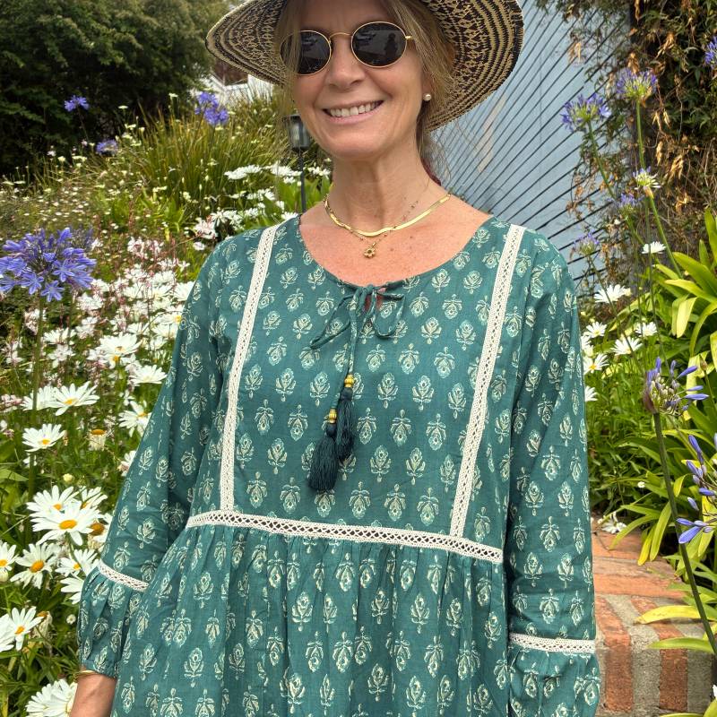 El Vestido Naan es parte de la colección Ananda Coast by Carola Montes, inspirada en la calma, la naturaleza y la belleza de los días de verano vividos sin prisa. Su tono verde suave y su delicado estampado evocan frescura, armonía y un estilo bohemio elegante.