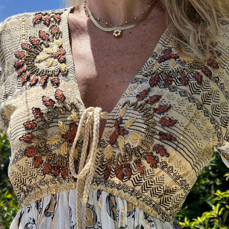 Vestido Stiges con sus bordados resaltan los detalles del diseño. Mangas que caen naturalmente con movimiento al moverte.